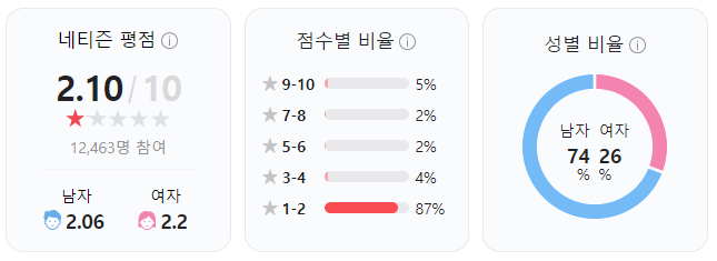 내가 최근에 본 영화중에서 아마 대중들에게 가장 많은 욕을 영화가 아닐까 싶다. 네이버 네티즌 평점이 말해준다. 그럼에도 불구하고 나는 처음부터 끝까지 정배속으로 다 봤다.